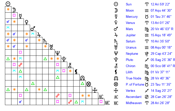 Sun | 12 Aries 59 | 13 Aries 12 | 10 Taurus 23 |