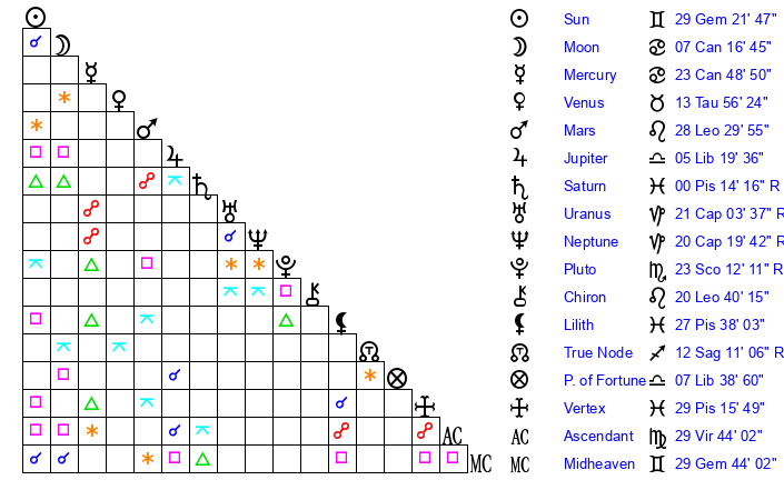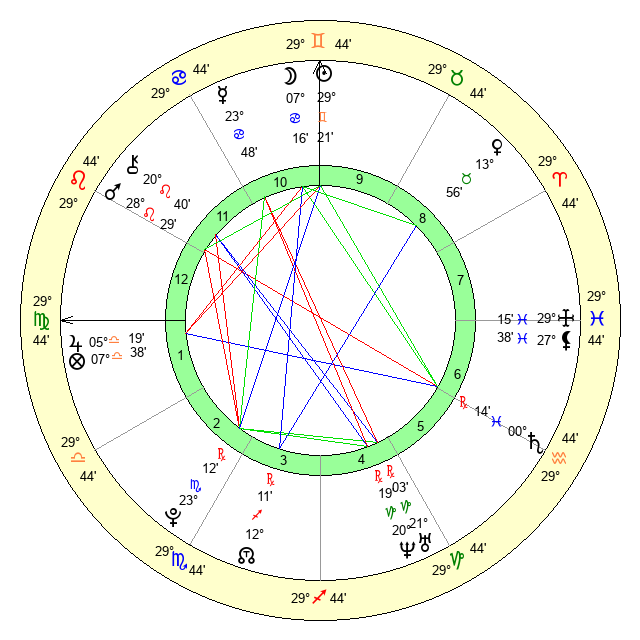 Moon | 7 Cancer 23 | 24 Aries 37 | 13 Virgo 45 |