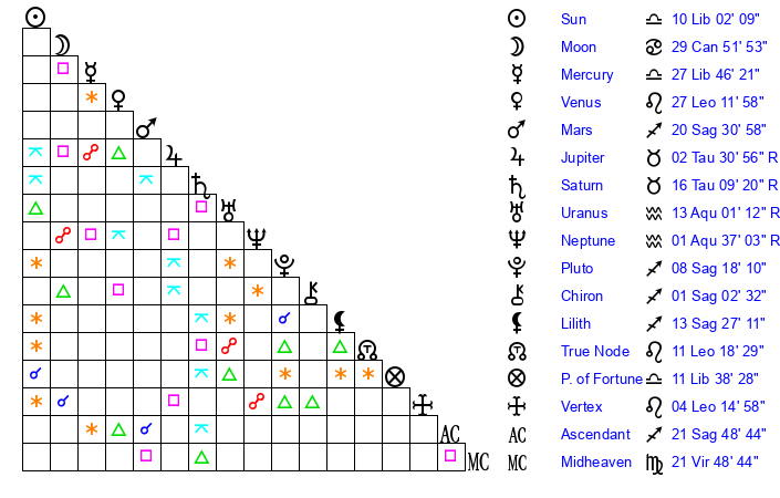 Sun | 10 Libra 2 | 10 Libra 44 | 5 Scorpio 50 |