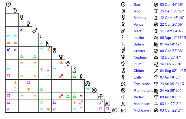 | Moon | 25 Gemini 5 | 8 Cancer 1 | 11 Aries 43 |
