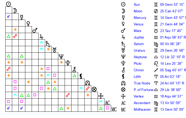 | Mercury | 14 Gemini 44 | 12 Gemini 24 | 10 Virgo 52 |