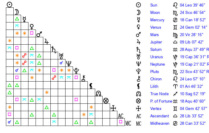 Moon | 24 Scorpio 46 | 10 Virgo 48 | 26 Capricorn 57 |