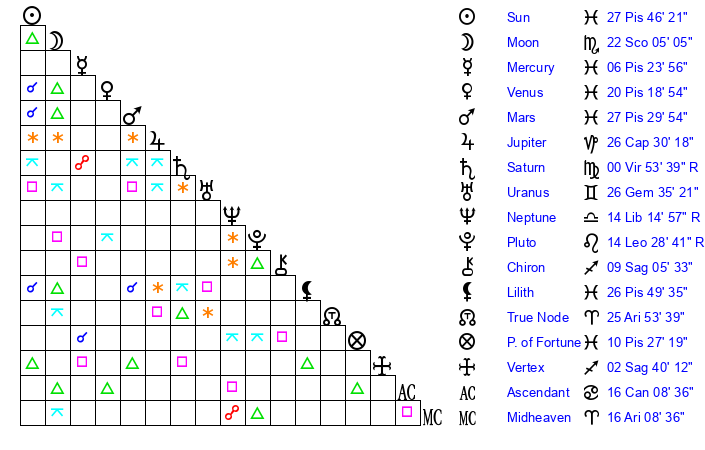 | Moon | 22 Scorpio 0 | 16 Scorpio 22 | 23 Leo 9 |