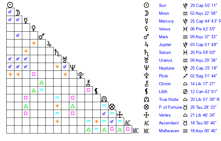 Mercury | 25 Capricorn 44 | 18 Capricorn 16 | 4 Aquarius 17 |