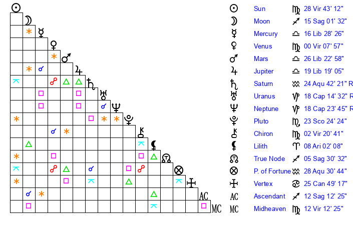 Moon | 15 Sagittarius 2 | 27 Virgo 27 | 15 Aquarius 45 |