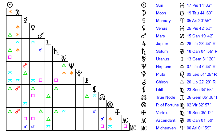 | Sun | 17 Pisces 14 | 18 Pisces 5 | 4 Gemini 33 |