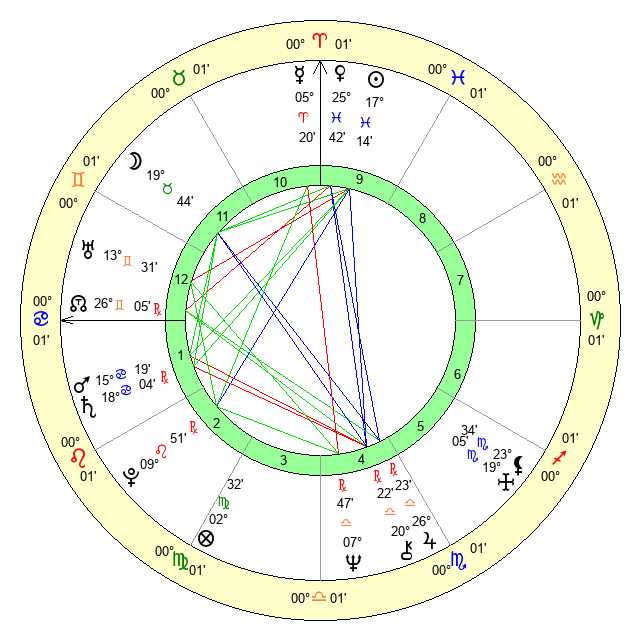 | Moon | 19 Taurus 44 | 9 Cancer 51 | 2 Aries 45 |