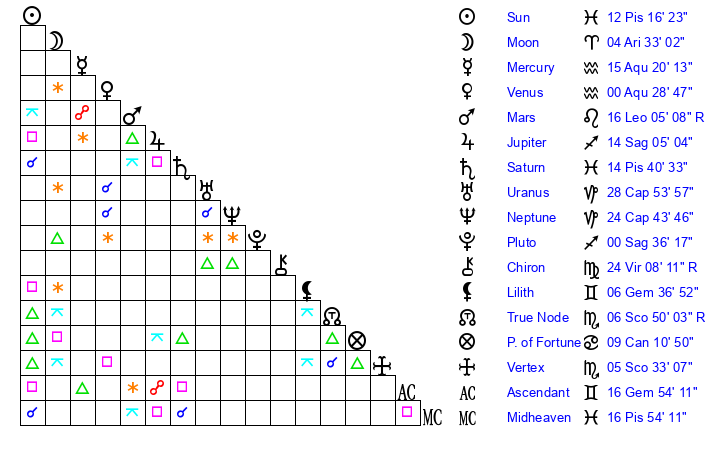 | Sun | 12 Pisces 16 | 12 Pisces 59 | 12 Aries 7 |