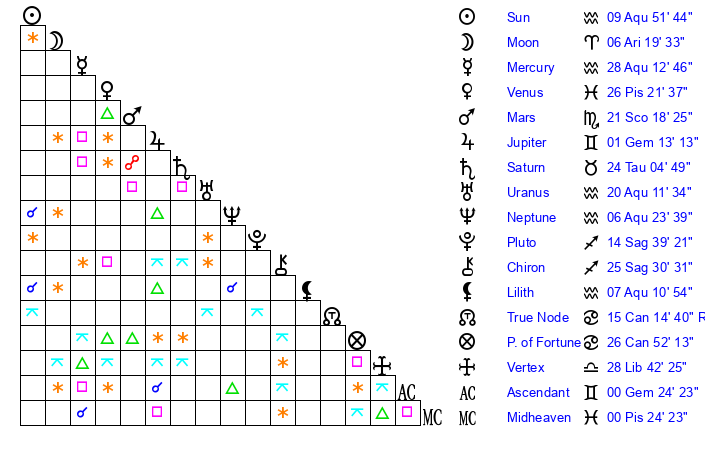 Moon | 6 Aries 19 | 12 Aquarius 20 | 27 Aquarius 7 |
