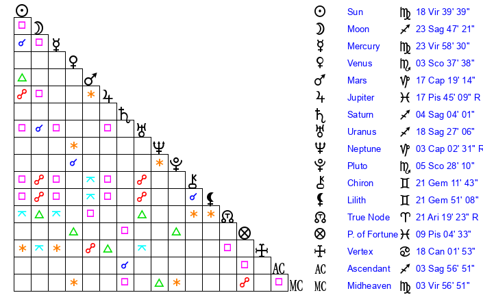 | Saturn | 4 Sagittarius 18 | 29 Pisces 7 | 7 Sagittarius 23 |