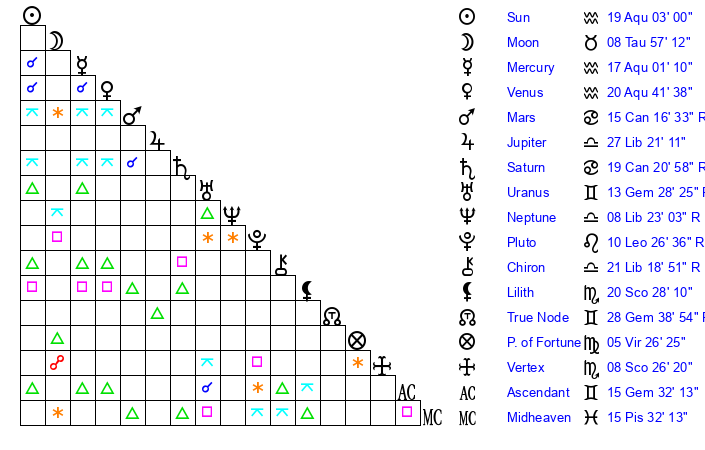 | Sun | 19 Aquarius 3 | 19 Aquarius 53 | 7 Taurus 31 |