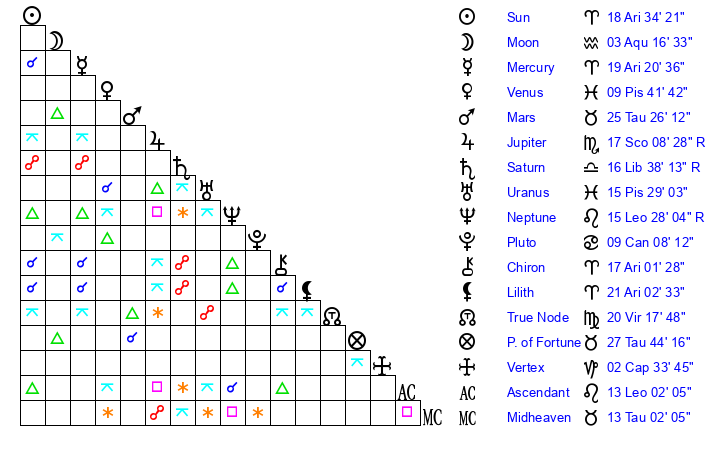 | Neptune | 15 Leo 27 | 0 Aries 22 | 17 Leo 5 |