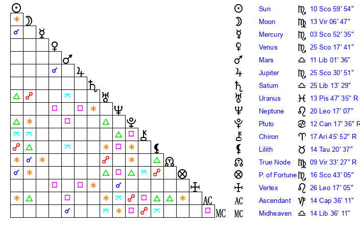 | Saturn | 25 Libra 47 | 25 Pisces 32 | 2 Scorpio 56 |