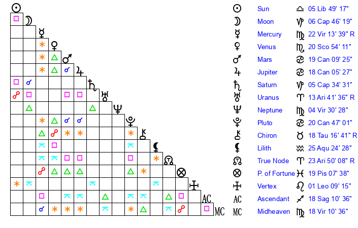Sun | 5 Libra 49 | 6 Libra 48 | 11 Capricorn 21 |