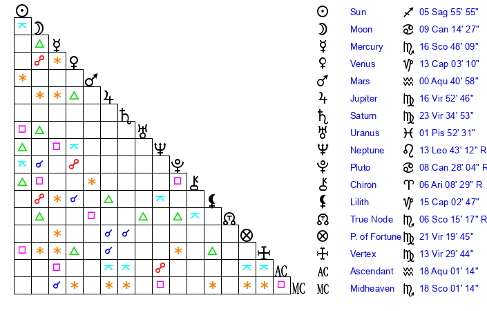 | Sun | 5 Sagittarius 56 | 6 Sagittarius 28 | 22 Pisces 20 |