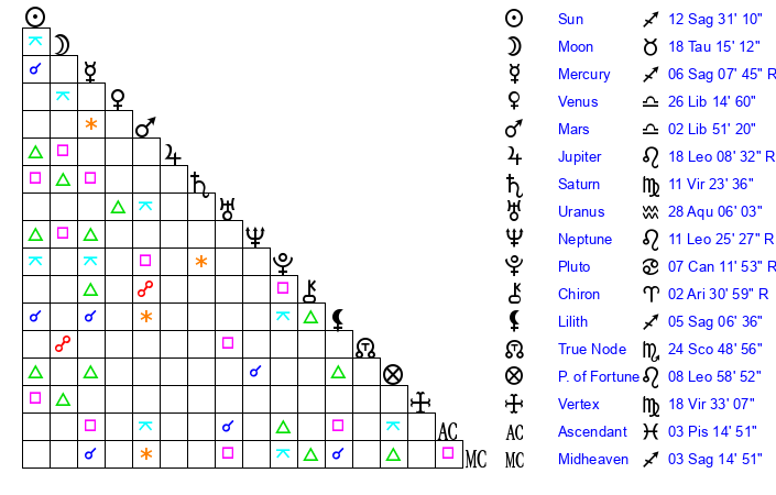 | Sun | 12 Sagittarius 31 | 13 Sagittarius 49 | 29 Pisces 47 |