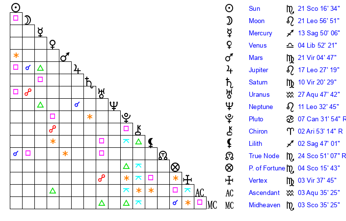 | Sun | 21 Scorpio 16 | 22 Scorpio 34 | 8 Pisces 49 |