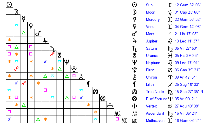 | Sun | 12 Gemini 32 | 13 Gemini 8 | 23 Virgo 15 |