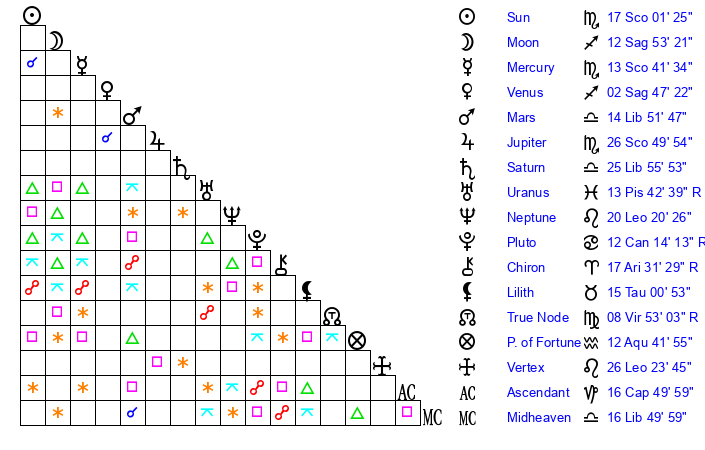 | Sun | 17 Scorpio 1 | 18 Scorpio 18 | 0 Pisces 33 |