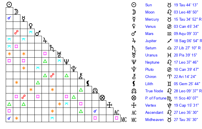 | Sun | 19 Taurus 44 | 20 Taurus 17 | 26 Leo 24 |