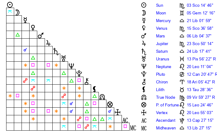 | Uranus | 13 Pisces 56 | 0 Gemini 27 | 15 Pisces 48 |