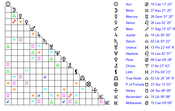| Moon | 27 Aquarius 19 | 9 Aquarius 42 | 8 Sagittarius 54 |