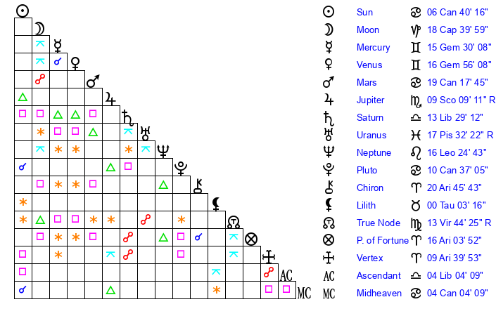 | Pluto | 10 Cancer 37 | 3 Aquarius 9 | 12 Cancer 22 |