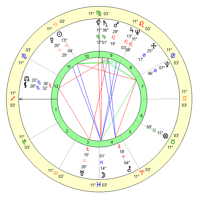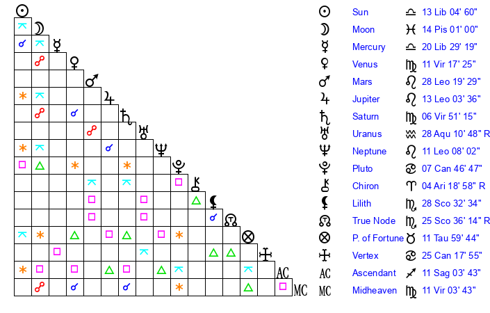 Saturn | 7 Virgo 30 | 27 Pisces 10 | 11 Virgo 40 |