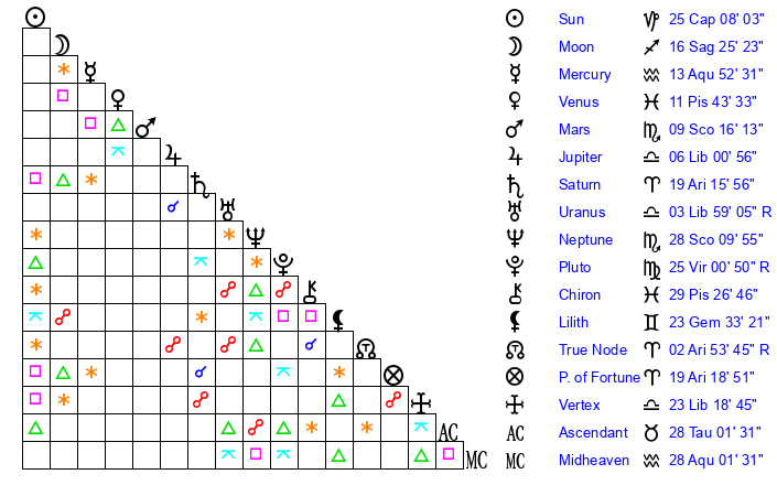 Moon | 16 Sagittarius 37 | 14 Leo 5 | 6 Capricorn 47 |