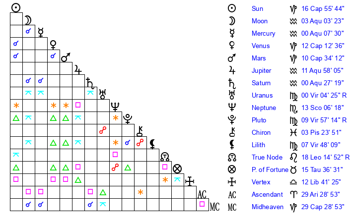 | Mars | 10 Capricorn 34 | 29 Cancer 32 | 29 Aquarius 31 |