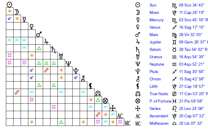 Moon | 11 Capricorn 32 | 11 Scorpio 46 | 0 Sagittarius 39 |