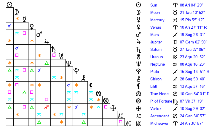 Moon | 21 Taurus 16 | 27 Pisces 47 | 8 Aries 38 |