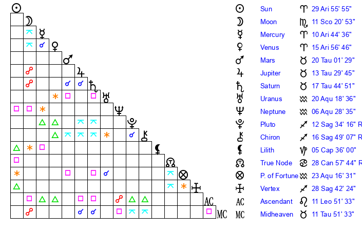 Sun | 29 Aries 56 | 29 Aries 53 | 24 Taurus 11 |