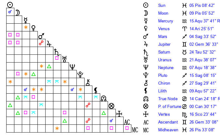 Mercury | 15 Aquarius 38 | 17 Pisces 2 | 3 Pisces 7 |