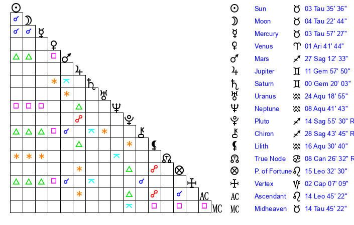 Sun | 3 Taurus 36 | 3 Taurus 47 | 26 Taurus 51 |