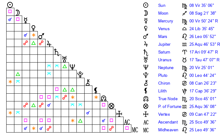 | Sun | 8 Virgo 35 | 9 Virgo 30 | 4 Sagittarius 48 |