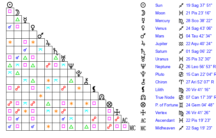 | Sun | 19 Sagittarius 38 | 20 Sagittarius 37 | 29 Pisces 48 |