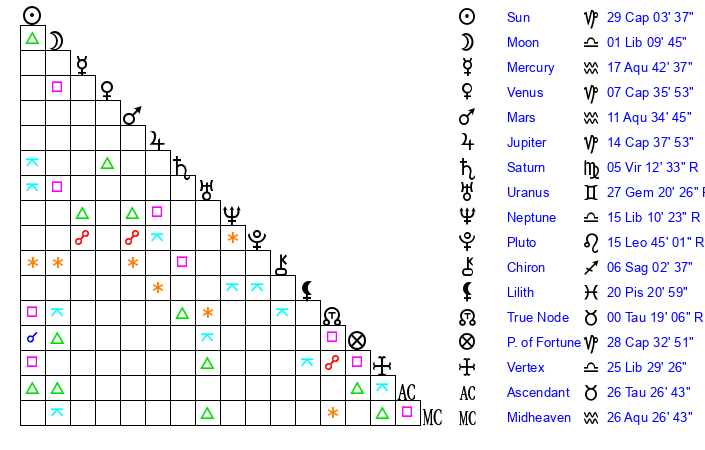 | Neptune | 15 Libra 10 | 27 Pisces 38 | 13 Libra 45 |