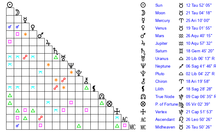 | Moon | 21 Taurus 1 | 29 Cancer 50 | 10 Aries 28 |