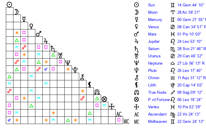 | Moon | 28 Aries 31 | 10 Libra 37 | 21 Scorpio 54 |