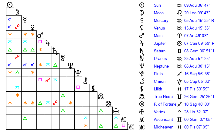 Moon | 20 Leo 4 | 12 Aquarius 20 | 17 Gemini 8 |