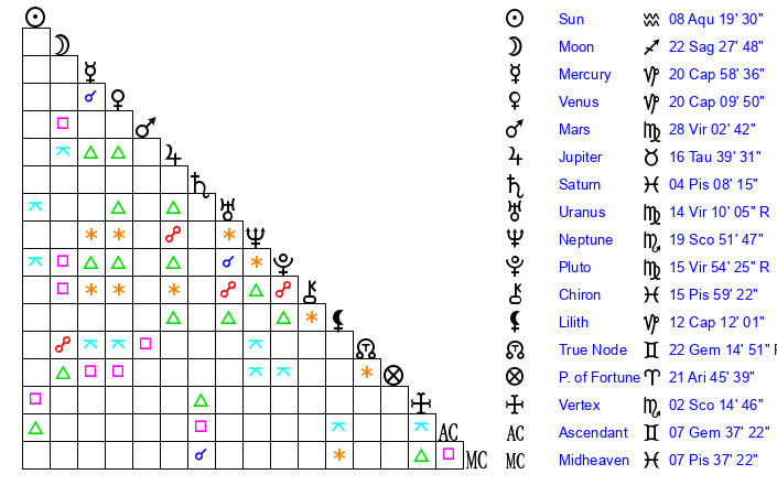 Uranus | 14 Virgo 14 | 23 Taurus 16 | 11 Virgo 47 |