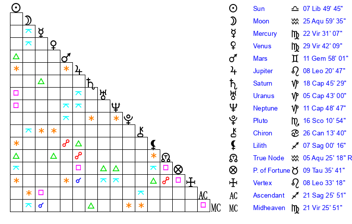 Moon | 26 Aquarius 0 | 22 Capricorn 54 | 15 Gemini 40 |
