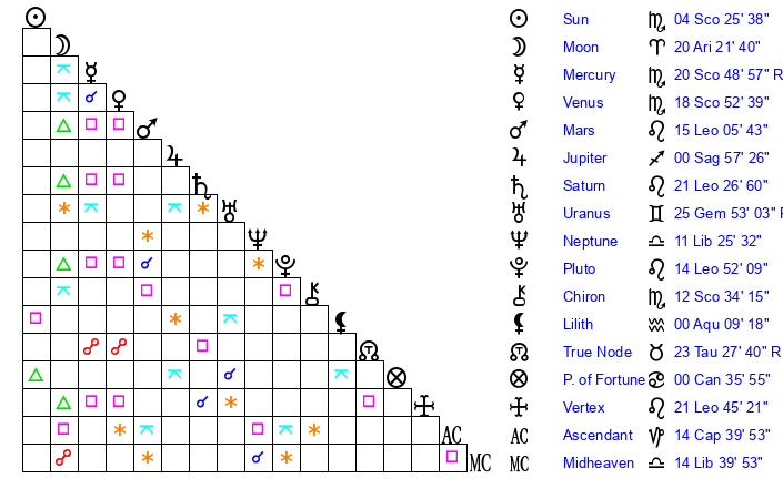 | Neptune | 11 Libra 26 | 29 Pisces 51 | 12 Libra 59 |