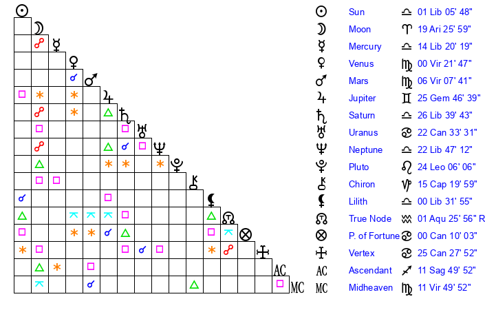 | Moon | 19 Aries 19 | 1 Scorpio 0 | 1 Sagittarius 31 |