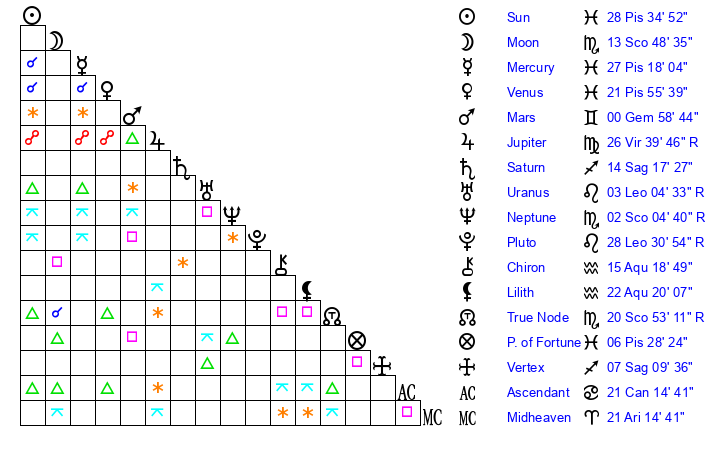Jupiter | 26 Virgo 28 | 14 Gemini 12 | 21 Virgo 45 |