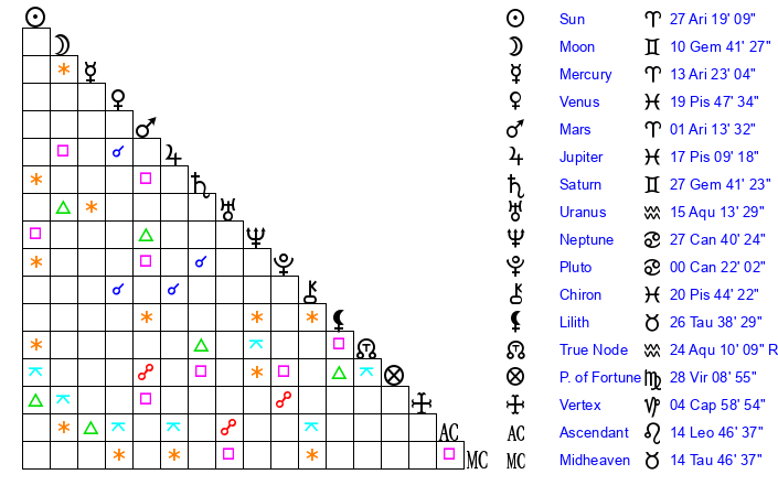 | Moon | 10 Gemini 40 | 28 Sagittarius 3 | 21 Gemini 45 |