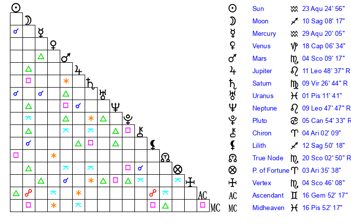 | Saturn | 10 Virgo 13 | 18 Pisces 45 | 5 Virgo 55 |