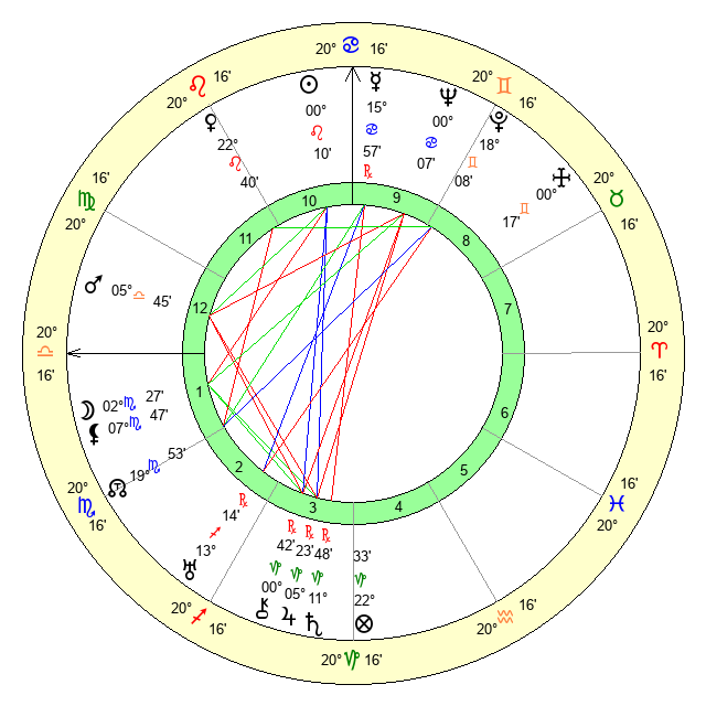 | Mercury | 16 Cancer 0 | 14 Leo 32 | 12 Scorpio 4 |