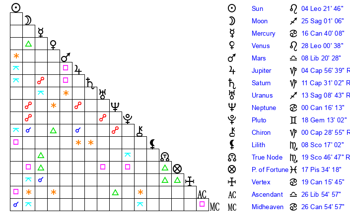 | Moon | 26 Sagittarius 25 | 18 Virgo 3 | 21 Cancer 0 |